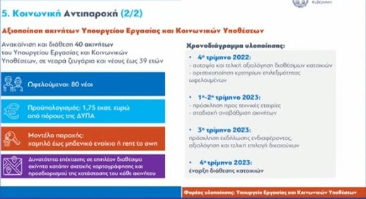 Το χρονοδιάγραμμα προβλέπει την έναρξη διάθεσης των κατοικιών στο 4ο τρίμηνο του 2023, αφού ολοκληρωθεί η αναβάθμιση των ακινήτων και η επιλογή των ωφελουμένων.