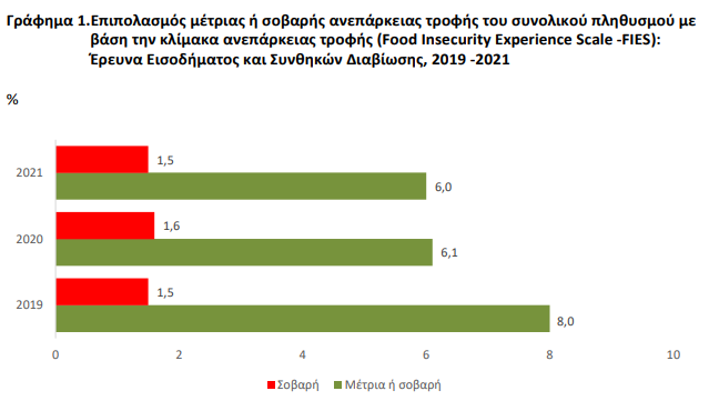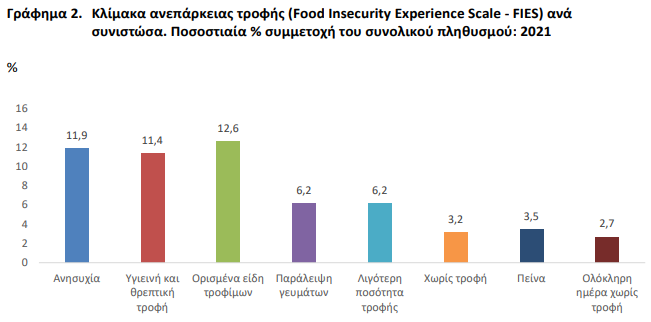 Το 6% του ελληνικού πληθυσμού αντιμετώπισε το 2021 μέτρια ή σοβαρή ανεπάρκεια τροφής, σύμφωνα με στοιχεία της Έρευνας Εισοδήματος και Συνθηκών Διαβίωσης των Νοικοκυριών της ΕΛΣΤΑΤ. Παράλληλα, τo 11,4% του πληθυσμού δεν είχε τη δυνατότητα να τραφεί με υγιεινή και θρεπτική τροφή, τo 12,6% έφαγε μόνο ορισμένα είδη τροφών, ενώ τo 6,2% του πληθυσμού αναγκάστηκε να παραλείψει ένα γεύμα.