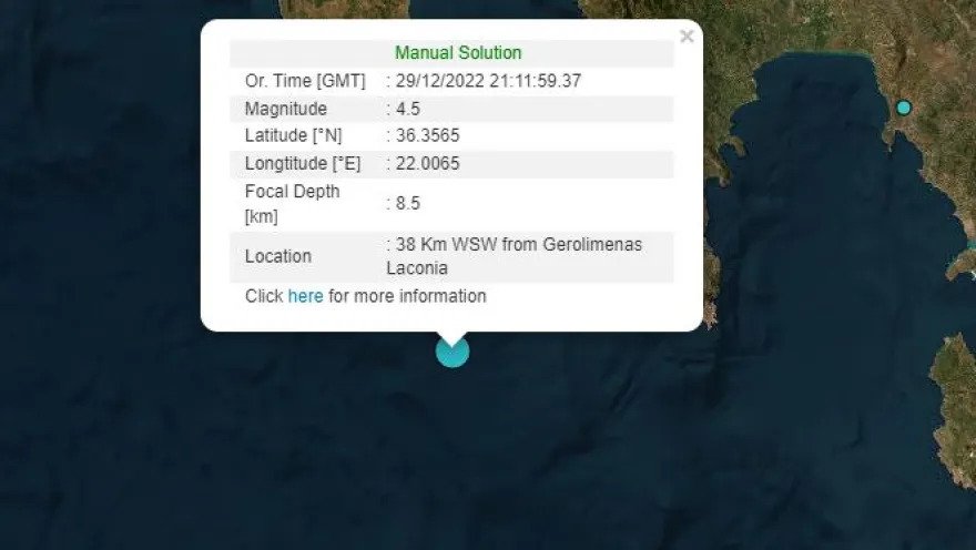 Σύμφωνα με την αναθεωρημένη λύση του Γεωδυναμικού Ινστιτούτου του Εθνικού Αστεροσκοπείου Αθηνών, ο σεισμός είχε μέγεθος 4,5 βαθμών της κλίμακας Ρίχτερ και το επίκεντρο εντοπίστηκε στον θαλάσσιο χώρο 38 χιλιόμετρα δυτικά, νοτιοδυτικά του Γερολιμένα Λακωνίας.