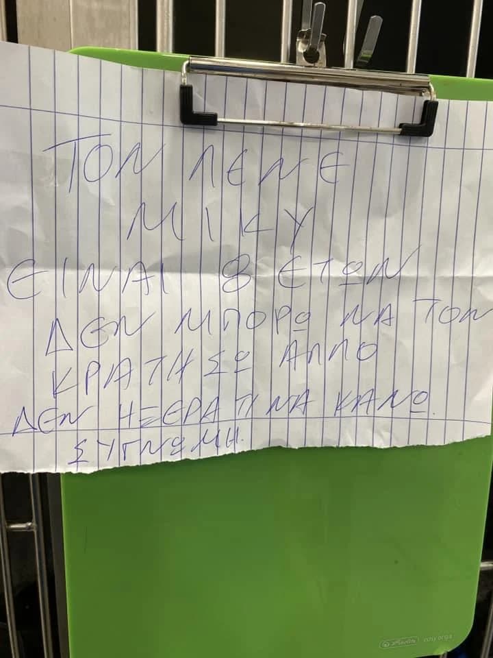 «Εγκατάλειψη σκύλου έξω από την κλινική. Παρακαλείται οποίος γνωρίζει κάτι ή ο ίδιος που απεικονίζεται στο βίντεο να επικοινωνήσει μαζί μας. Πείτε μας ποιο είναι το πρόβλημα σας μήπως μπορούμε να βοηθήσουμε. Αλλά να αφήσετε έτσι ξημερώματα 02:13 το σκυλάκι μόνο του δεμένο στο παγκάκι είναι πράξη ανεύθυνη και ποινικά κολάσιμη. Από Δευτέρα αν δεν έχουμε νέα θα απευθυνθούμε στις αρχές και θα βρεθεί η ταυτότητα σας, όποτε θα έχετε συνέπειες πράγμα που δεν είναι ο σκοπός μας».