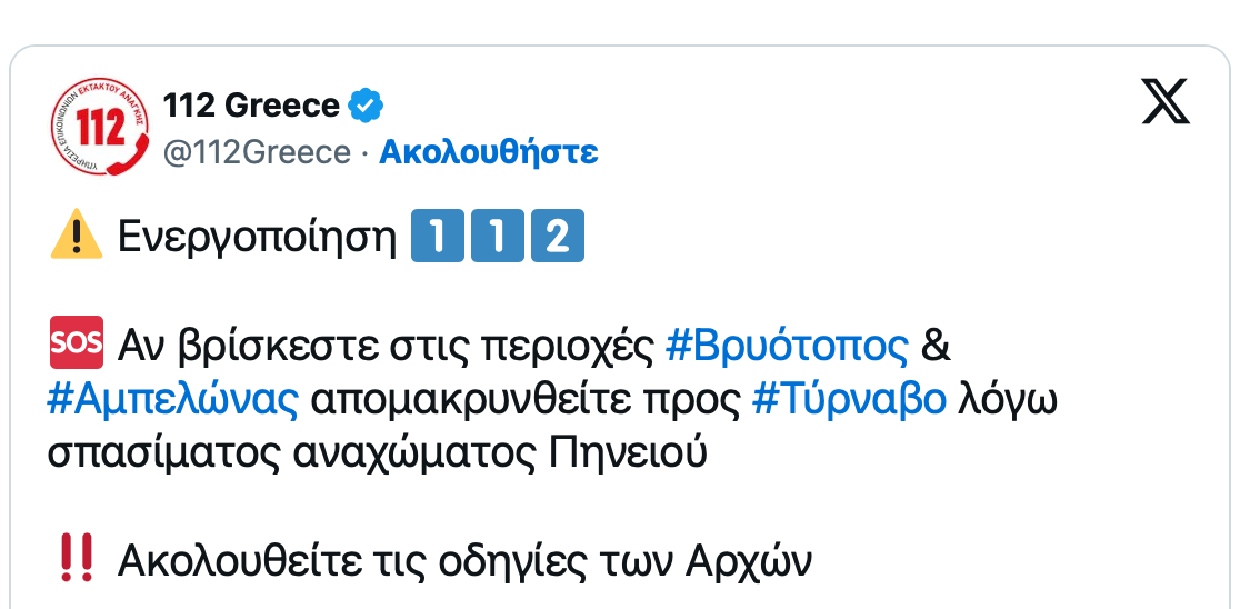 Ανάχωμα του Πηνειού έσπασε με αποτέλεσμα να κινδυνεύουν ο Βρυότοπος και ο Αμεπλώνας. Μήνυμα του 112 εστάλη στους κατοίκους των περιοχών, προκειμένου να απομακρυνθούν από αυτές και να κατευθυνθούν προς τον Τύρναβο.