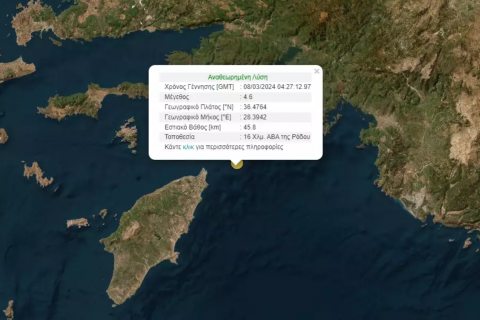 ΚΟΙΝΩΝΙΑ 08.03.24 07:43 Σεισμός 4,6 βαθμών ταρακούνησε τη Ρόδο - Ιδιαίτερα αισθητός Ο σεισμός ήταν ιδιαίτερος αισθητός και είχε διάρκεια