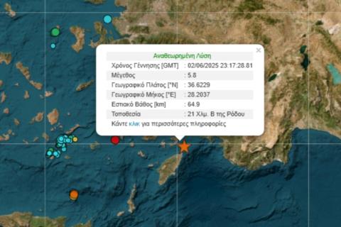ΚΟΙΝΩΝΙΑ 03.06.25 06:58 Ισχυρός σεισμός 5,8 Ρίχτερ ταρακούνησε τη Ρόδο - Καθησυχαστικοί οι σεισμολόγοι Μέχρι στιγμής δεν έχουν αναφερθεί σοβαρές υλικές ζημιές ή τυχόν τραυματισμοί από τον σεισμό.