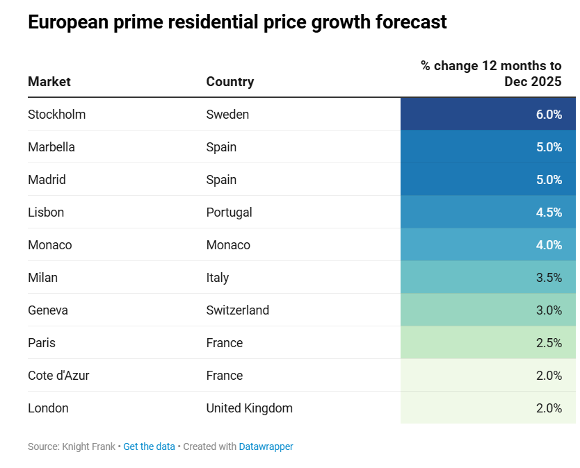 Πόλεις όπως η Στοκχόλμη, η Μαρμπέλα και η Μαδρίτη θα ηγηθούν της ανόδου, καταγράφοντας αυξήσεις τιμών άνω του 5%, σύμφωνα με την Knight Frank. Το Λονδίνο και το Παρίσι θα παραμείνουν κορυφαίες αγορές πολυτελείας παρά την πολιτική αστάθεια.