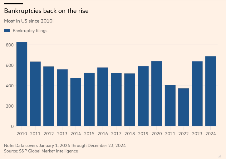 Όπως μεταδίδουν οι Financial Times, τουλάχιστον 686 αμερικανικές εταιρείες κατέθεσαν αίτηση πτώχευσης το 2024, ποσοστό περίπου 8% υψηλότερο από το 2023 και υψηλότερο από κάθε άλλη χρονιά από τις 828 αιτήσεις το 2010, σύμφωνα με τα στοιχεία της S&P Global Market Intelligence.