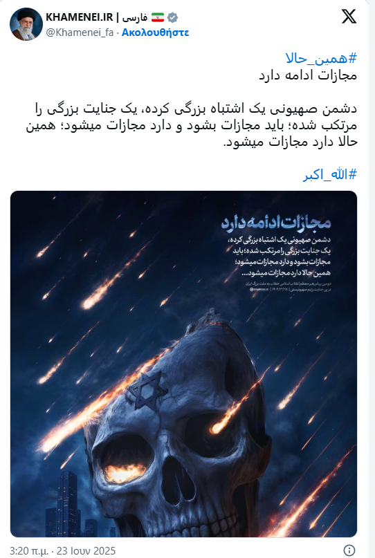 Μέσω ανάρτησής του στην πλατφόρμα Χ (πρώην Twitter), ο Χαμενεΐ επανέλαβε την αταλάντευτη στάση του απέναντι στο Ισραήλ, τονίζοντας ότι η «τιμωρία συνεχίζεται». Σύμφωνα με τα όσα ανέφερε, πυραυλικές επιθέσεις κατά ισραηλινών στόχων εξαπολύθηκαν κατά τη διάρκεια της νύχτας, ως απάντηση στις «προκλήσεις και τα εγκλήματα» του Τελ Αβίβ.