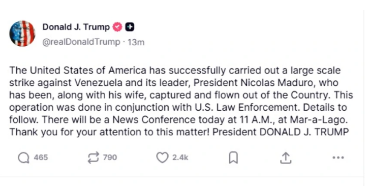 «Οι Ηνωμένες Πολιτείες της Αμερικής πραγματοποίησαν με επιτυχία μια μεγάλης κλίμακας επίθεση εναντίον της Βενεζουέλας και του ηγέτη της, Προέδρου Νικολάς Μαδούρο, ο οποίος, μαζί με τη σύζυγό του, συνελήφθη και μεταφέρθηκε αεροπορικώς εκτός της χώρας. Η επιχείρηση αυτή πραγματοποιήθηκε σε συνεργασία με τις αμερικανικές αρχές επιβολής του νόμου. Λεπτομέρειες θα ακολουθήσουν. Σήμερα στις 11 π.μ. θα πραγματοποιηθεί συνέντευξη Τύπου στο Mar-a-Lago. Σας ευχαριστούμε για την προσοχή σας σε αυτό το θέμα!»