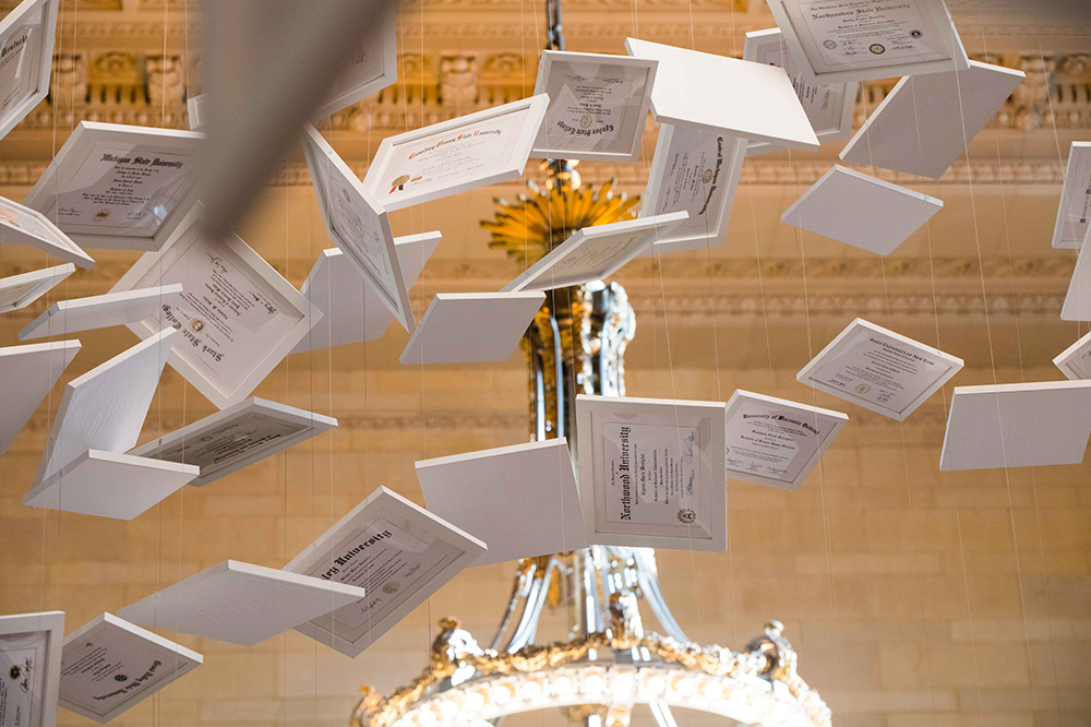 Πόσο κοστίζει μία τετραετής φοίτηση στις ΗΠΑ; Αυτό προσπαθούν να αποτυπώσουν οι δημιουργοί του έργου, καθώς κάθε πτυχίο που κρέμεται αποτιμάται σε περισσότερα από 180.000 δολάρια.