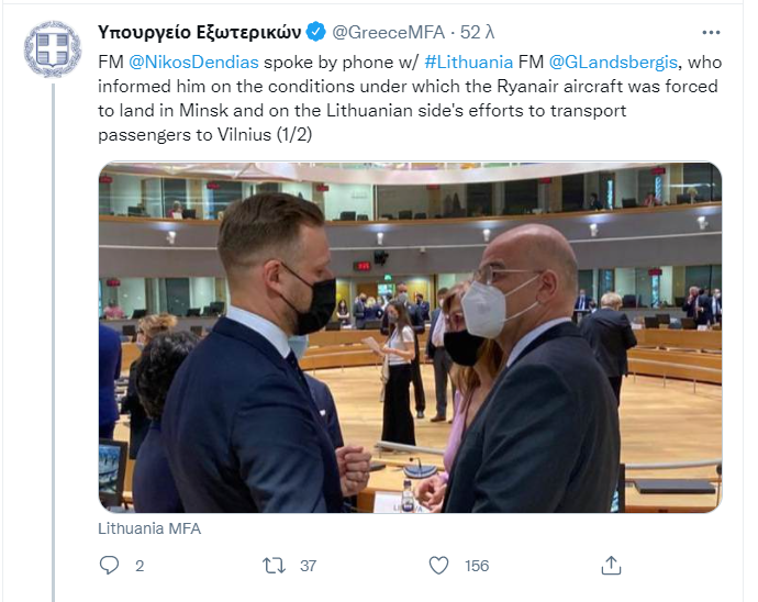 Ο Έλληνας υπουργός Εξωτερικών είχε νωρίτερα τηλεφωνική επικοινωνία με τον Λιθουανό ομόλογό του G. Landsbergis ο οποίος τον ενημέρωσε, για τις συνθήκες κάτω από τις οποίες το αεροπλάνο της Ryaniair εξαναγκάστηκε σε προσγείωσε στο Μινσκ, αλλά και τις ενέργειες της Λιθουανίας να μεταφέρει τους επιβάτες στο Βίλνιους.