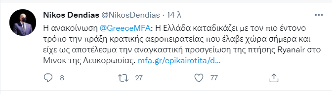 "Με τον πιο έντονο τρόπο καταδικάζει η Ελλάδα την πράξη κρατικής αεροπειρατείας που έλαβε χώρα σήμερα και είχε ως αποτέλεσμα την αναγκαστική προσγείωση της πτήσης Ryanair FR 4978, που εκτελούσε το δρομολόγιο Αθήνα-Βίλνιους, στο Μινσκ της Λευκορωσίας.