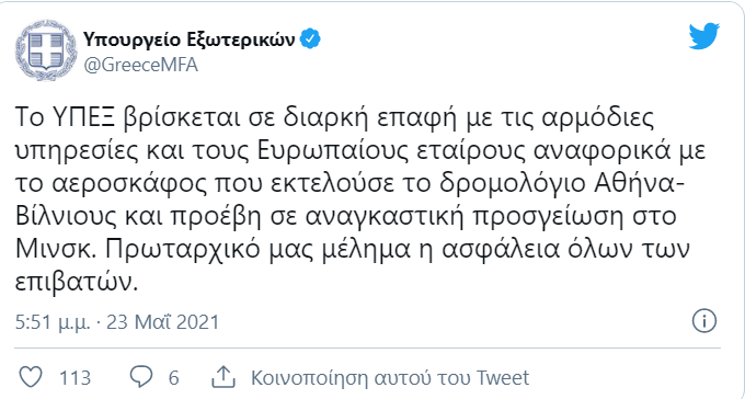 Το ελληνικό υπουργείο Εξωτερικών αναφέρει οτι βρίσκεται σε διαρκή επαφή με τις αρμόδιες υπηρεσίες και τους τους Ευρωπαιους εταίρους αναφορικά με το αεροσκάφος που εκτελούσε το δρομολόγιο Αθήνα - Βίλνιου και προέβη σε αναγκαστική προσγείωση στο Μινσκ.