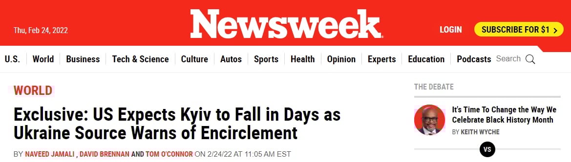 Οι Αμερικανοί αξιωματούχοι, μιλώντας υπό τον όρο της ανωνυμίας στο Newsweek, δήλωσαν ότι οι ρωσικές δυνάμεις θα υπονομεύσουν την ικανότητα της χώρας να αντιμετωπίσει τη Ρωσία περικυκλώνοντας τις ουκρανικές δυνάμεις και αναγκάζοντάς τες να παραδοθούν εντός 96 ωρών, σύμφωνα με την εφημερίδα.