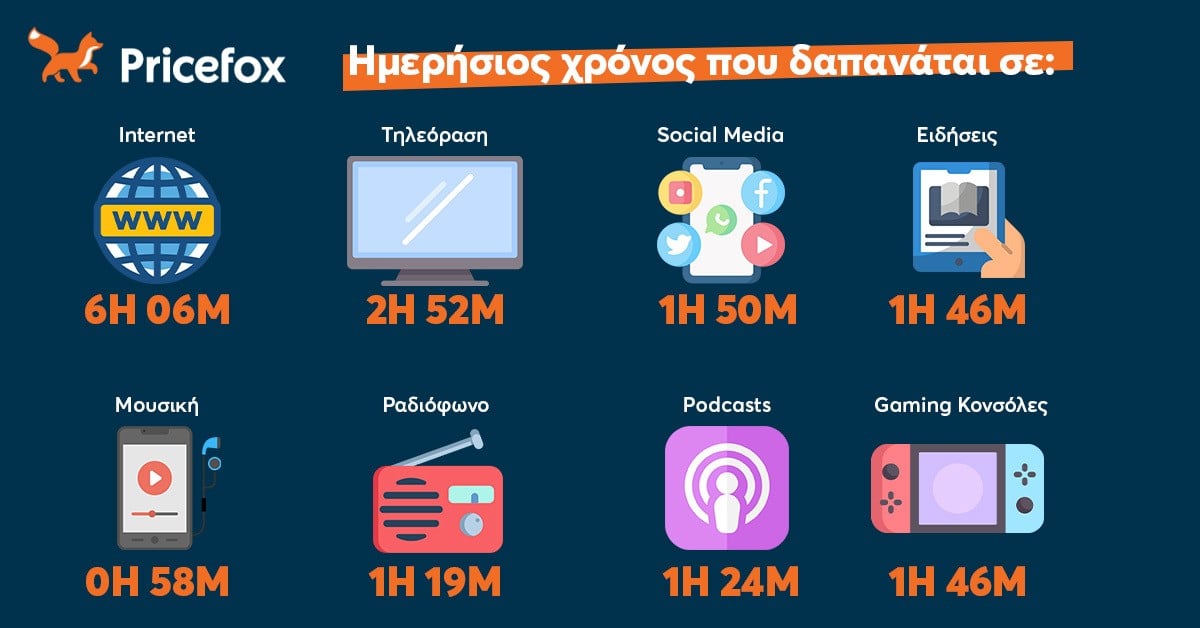 Αναλυτικά, όπως φαίνεται από την ανάλυση της Pricefox, οι Έλληνες ξοδεύουν μεγάλο μέρος του χρόνου τους καθημερινά στα media: