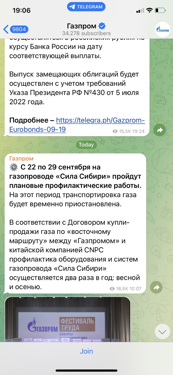 Στην ανακοίνωσή της η Gazprom αναφέρει τα εξής: «Από τις 22 Σεπτεμβρίου έως τις 29 Σεπτεμβρίου θα πραγματοποιηθούν προγραμματισμένες εργασίες συντήρησης στον αγωγό φυσικού αερίου Power of Siberia. Κατά τη διάρκεια αυτής της περιόδου, η μεταφορά φυσικού αερίου θα ανασταλεί προσωρινά.