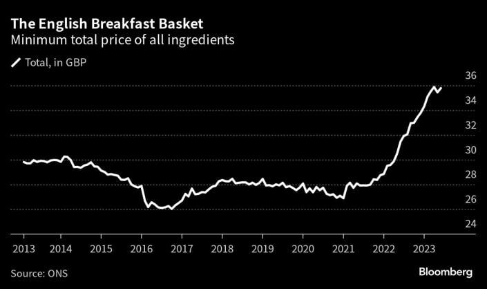 Όλα τα υλικά ενός αγγλικού πρωινού σημείωσαν αύξηση τιμών κατά το τελευταίο έτος. Τα αυγά είναι σχεδόν 30% ακριβότερα από ό,τι τον Ιούνιο του 2022, ενώ το ψωμί και το γάλα έχουν αυξηθεί κατά 24,3% και 23,6% αντίστοιχα, την ίδια περίοδο.