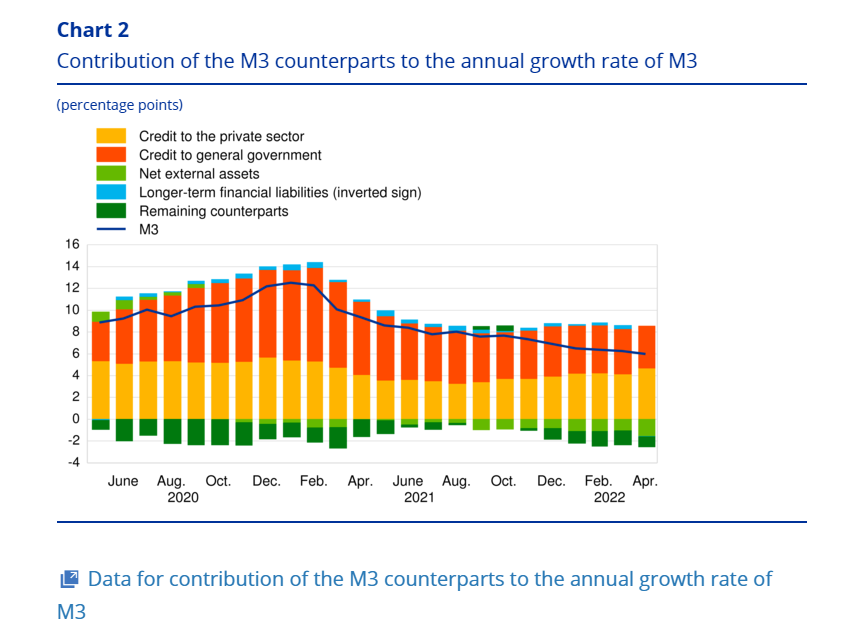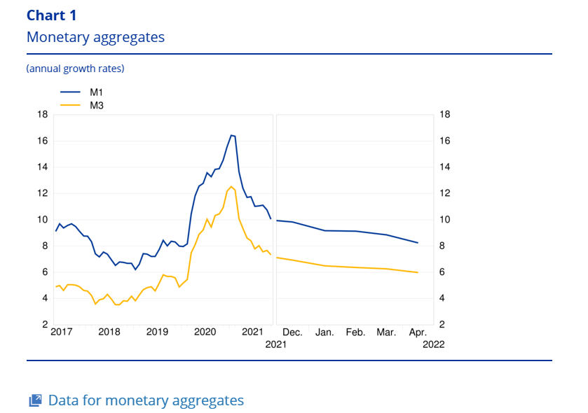 Στο 6,0% υποχώρησε τον Απρίλιο του 2022 ο ετήσιος ρυθμός ανάπτυξης του δείκτη κυκλοφορίας χρήματος Μ3 στην Ευρωζώνη από 6,3% τον Μάρτιο, σύμφωνα με τα στοιχεία που ανακοίνωσε σήμερα η Ευρωπαϊκή Κεντρική Τράπεζα.