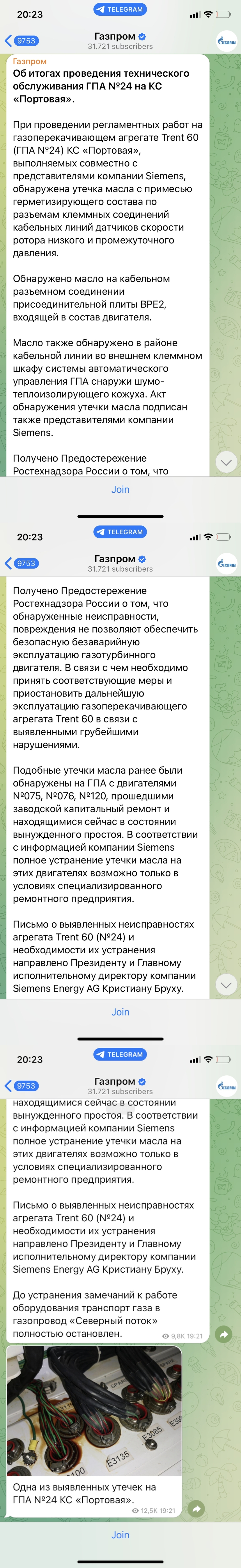 Η Gazprom eπικαλείται της Siemens Energy, αναφέροντας ότι «η πλήρης αντιμετώπιση της διαρροής λαδιού σε αυτούς τους κινητήρες είναι δυνατή μόνο από εξειδικευμένο συνεργείο», προσθέτοντας ότι «επιστολή σχετικά με τις διαπιστωθείσες δυσλειτουργίες της μονάδας Trent 60 (Νο 24) και την ανάγκη αντιμετώπισής τους εστάλη στον Πρόεδρο και Διευθύνοντα Σύμβουλο της Siemens Energy AG, Christian Bruch».
