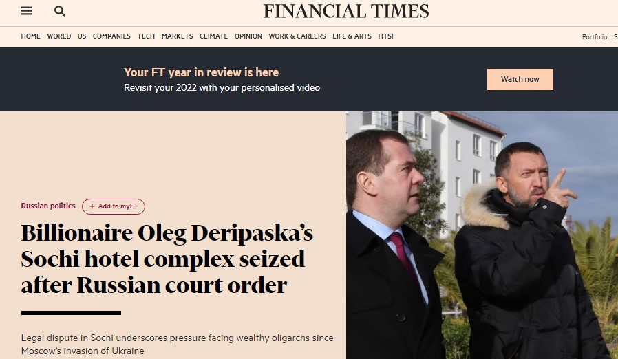 Δικαστήριο στη Ρωσία διέταξε την κατάσχεση περιουσιακών στοιχείων του Ρώσου επιχειρηματία Όλεγκ Ντεριπάσκα, εκτιμώμενης αξίας ενός δισεκατομμυρίου δολαρίων και του στέρησε πανάκριβη έκταση γης στην περιοχή του Κρασνοντάρ, μετά την παράκληση του Κρεμλίνου προς τον ίδιο να σταματήσει να ασκεί κριτική στον πόλεμο στην Ουκρανία, γράφει η εφημερίδα The Financial Times (στο άρθρο της: Billionaire Oleg Deripaska’s Sochi hotel complex seized after Russian court order) επικαλούμενη ανώνυμες πηγές. Ο εκπρόσωπος τύπου του Κρεμλίνου Ντμίτρι Πεσκόφ δεν επιβεβαιώνει την εξέλιξη αυτή.