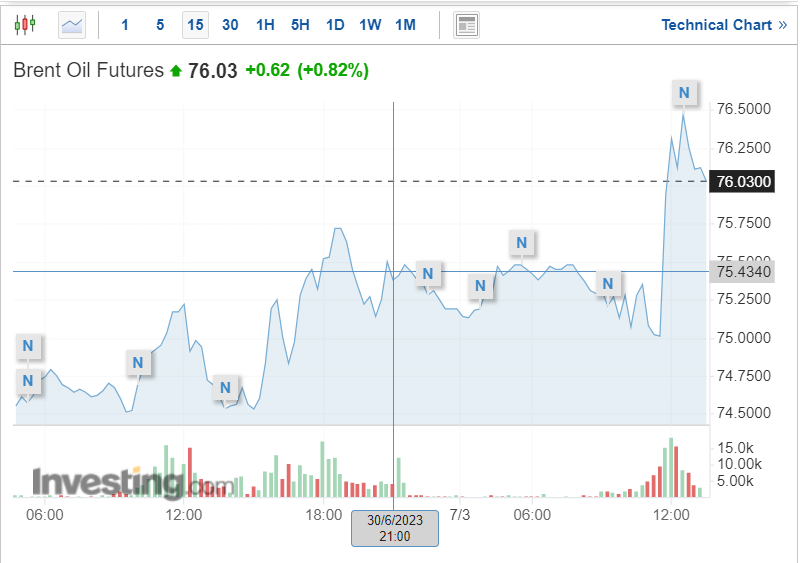 Τα futures του πετρελαίου μπρεντ σημείωσαν άνοδο σχεδόν 90 σεντς ξεπερνώντας τα 76 δολάρια το βαρέλι στις 12:50 ώρα Ελλάδας, αφού ενισχύθηκαν κατά 0,8% την Παρασκευή. Το αμερικανικό αργό ήταν ενισχυμένο κατά 85 σεντς στα 71,49 δολάρια το βαρέλι αφού έκλεισε με άνοδο 1,1% κατά την προηγούμενη συνεδρίαση.