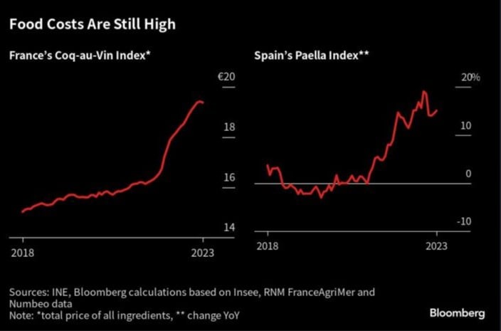 Μπορεί τα γενικά ποσοστά πληθωρισμού να επιβραδύνονται σε όλη την Ευρώπη, αλλά οι τιμές βασικών υλικών για την παρασκευή παραδοσιακών πιάτων στη Γαλλία και την Ισπανία αναδεικνύουν πως η χειρότερη κρίση κόστους ζωής εδώ και μια γενιά εξακολουθεί να μαίνεται.