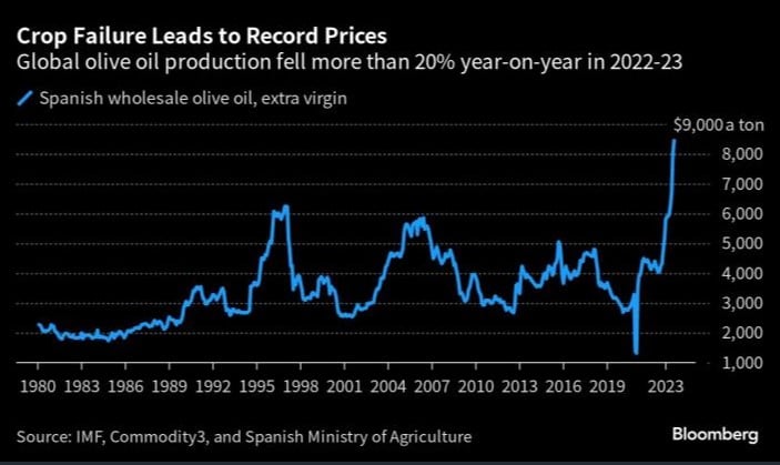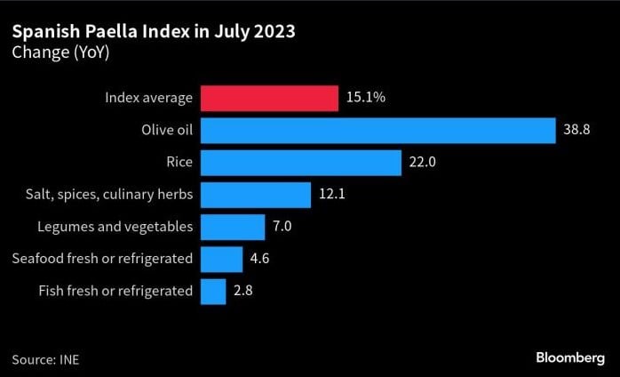 Μια ξεχωριστή μέτρηση του Bloomberg έδειξε ότι η παρασκευή παέγιας, το εθνικό πιάτο της Ισπανίας, ήταν κατά 15,1% ακριβότερη τον Ιούλιο σε σχέση με πέρυσι, λόγω του άλματος σχεδόν κατά 40% στο κόστος του ελαιολάδου, σύμφωνα με τα στοιχεία της Εθνικής Στατιστικής Υπηρεσίας.