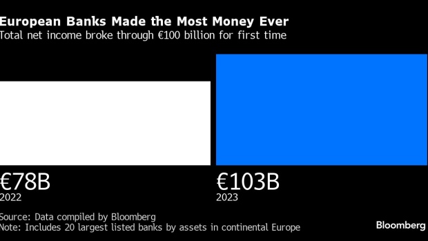 Τα συνολικά καθαρά κέρδη των 20 μεγαλύτερων τραπεζών της ηπειρωτικής Ευρώπης που ανακοίνωσαν αποτελέσματα εκτινάχθηκαν στα 103 δισ. ευρώ από 78 δισ. ευρώ το προηγούμενο έτος. Τα τρία τέταρτα των ευρωπαϊκών τραπεζών πέτυχαν τα υψηλότερα κέρδη στην ιστορία τους, σύμφωνα με τα στοιχεία που συγκέντρωσε το Bloomberg.