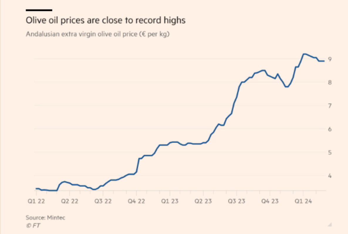 Το εξαιρετικά παρθένο ελαιόλαδο πωλούταν στην χονδρική κατά μέσο όρο για 2,13 ευρώ το κιλό στα τέλη του Φεβρουαρίου του 2020, αλλά τώρα κοστίζει 8,88 ευρώ, σύμφωνα με το Υπουργείο Γεωργίας της Ισπανίας, με τις τιμές να έχουν αυξηθεί κατά 70% μόνο το τελευταίο έτος.