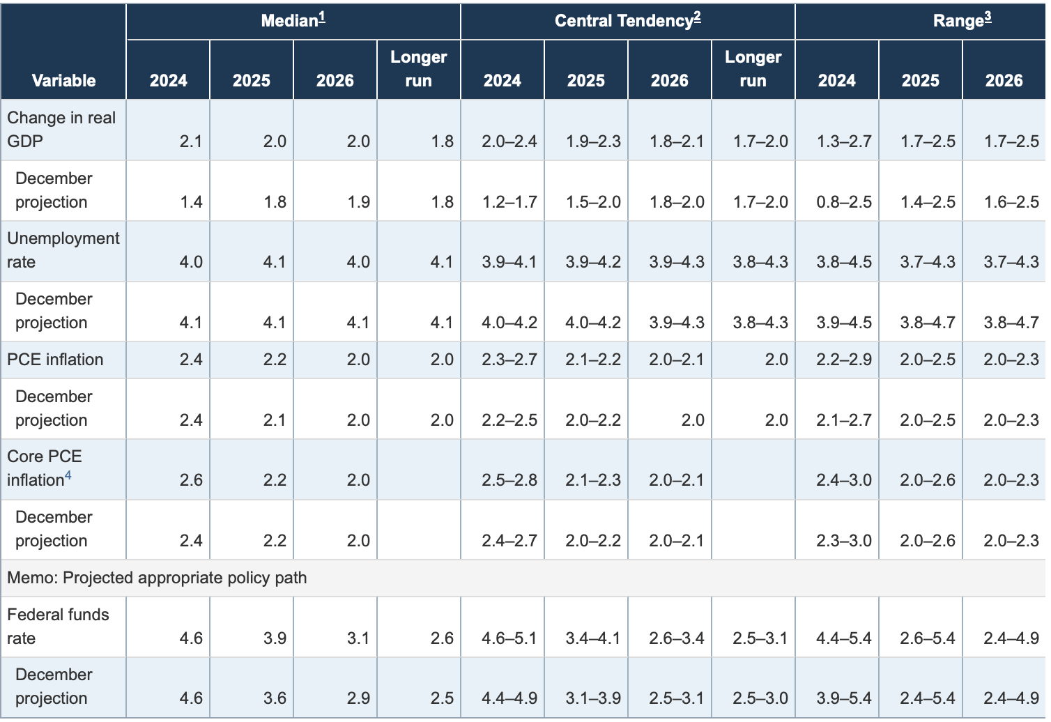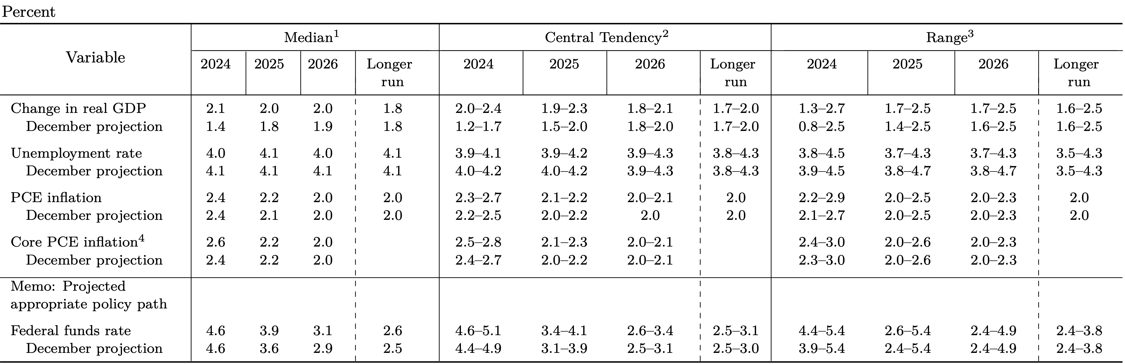 Οι αξιωματούχοι προβλέπουν ανάπτυξη στις ΗΠΑ 2,1% για το 2024, από 1,4% που προέβλεπαν τον Δεκέμβριο, ενώ βλέπουν μείωση του πληθωρισμού στο 2,4% το 2024, όσο δηλαδή προέβλεπαν και τον Δεκέμβριο.
