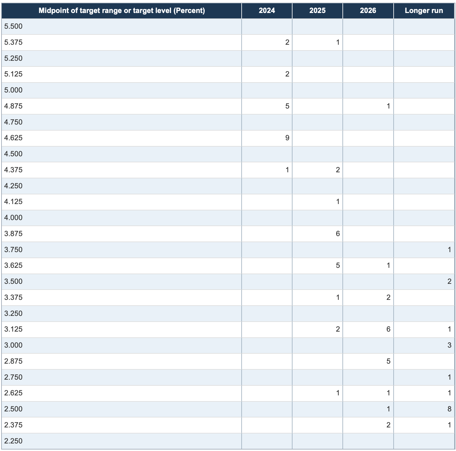 Όπως φαίνεται και από τις προβλέψεις της FED 9 αξιωματούχοι βλέπουν τρεις μειώσεις επιτοκίων μέσα στο 2024, 5 αξιωματούχοι βλέπουν 2 μειώσεις, ενώ 2 αξιωματούχοι προβλέπουν μόλις μια μείωση. Επίσης, 2 αξιωματούχοι βλέπουν τα επιτόκια να παραμένουν σταθερά στην τρέχουσα κατάσταση ενώ ένας να μειώνονται 4 φορές μέσα στο 2024.