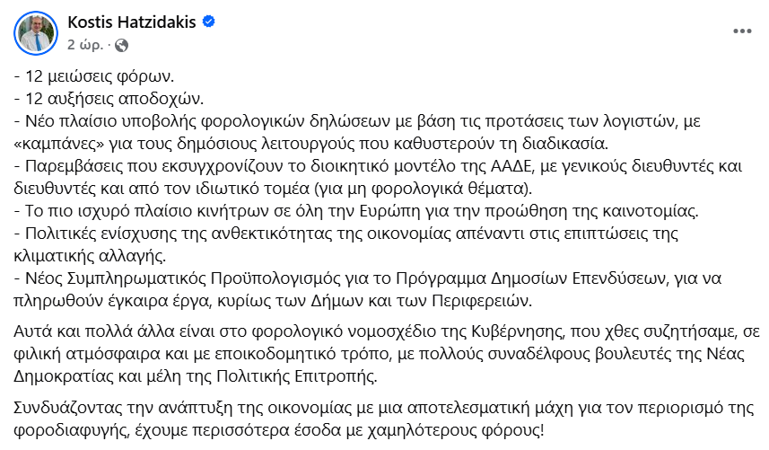 Σε ανάρτησή του στο Facebook, ο υπουργός Εθνικής Οικονομίας και Οικονομικών Κωστής Χατζηδάκης αναφέρθηκε σε μειώσεις φόρων και αυξήσεις αποδοχών, όπως και σε μια σειρά από κινήσεις που έχουν γίνει για τη βελτιστοποίηση του φορολογικού συστήματος.