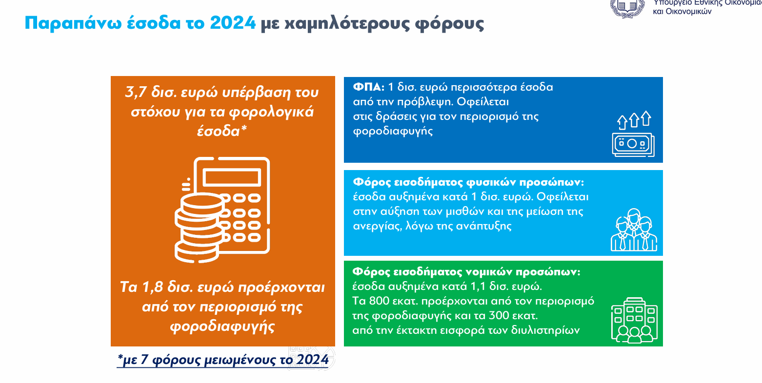 Ειδικότερα, οι κυριότερες μόνιμες δημοσιονομικές παρεμβάσεις που εφαρμόστηκαν το 2024 καθώς και οι νέες, οι οποίες θα εφαρμοστούν από το 2025, είναι οι ακόλουθες: