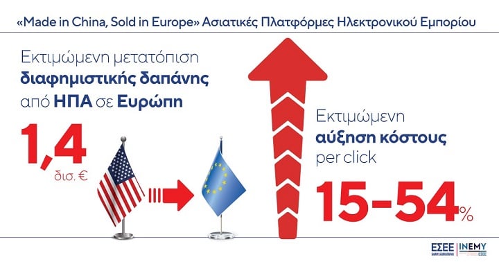 Ειδικότερα, η πρόσφατη πολιτική των ΗΠΑ οδήγησε σε δραστική μείωση της διαφημιστικής δαπάνης από την TEMU (-31%) και τη SHEIN (-19%) στις ΗΠΑ. Η ΕΣΕΕ υπολόγισε πως η διαφημιστική δαπάνη των ασιατικών πλατφορμών μειώθηκε στις ΗΠΑ κατά -1,2% έως -2,4% (~$1,4–2,9 δις), με μέση απώλεια $2,16 δις αν οι τάσεις διατηρηθούν.
