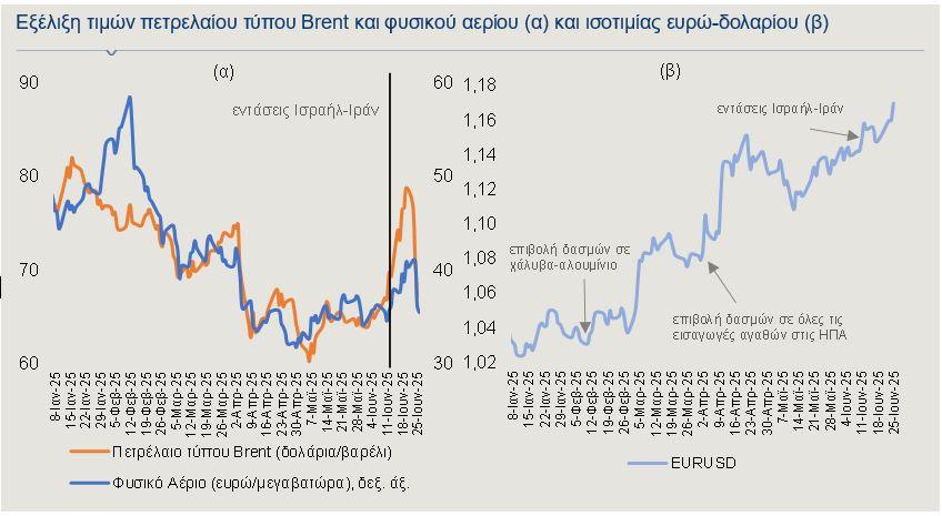 Η τιμή του Brent, παρότι έφτασε τα 81 δολ./βαρέλι στις 23 Ιουνίου, υποχώρησε στα 67,7 δολ./βαρέλι στις 25 Ιουνίου. Αντίστοιχα, η τιμή του φυσικού αερίου μειώθηκε κατά 2%, φτάνοντας τα 35,5 ευρώ/MWh. Και οι δύο τιμές παραμένουν χαμηλότερες σε σχέση με τις αρχές του έτους, κυρίως λόγω των ανησυχιών για επιβράδυνση της παγκόσμιας οικονομίας.