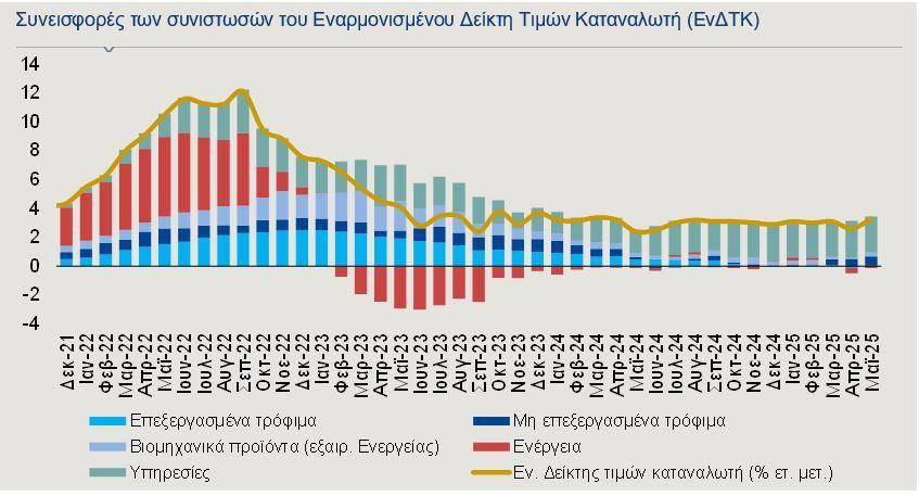 Ο Εναρμονισμένος Δείκτης Τιμών Καταναλωτή (ΕνΔΤΚ) διαμορφώθηκε στο 3% κατά το πρώτο πεντάμηνο του 2025, ελαφρώς χαμηλότερα σε σχέση με το 2024. Τον Μάιο, όμως, σημείωσε άνοδο στο 3,3% από 2,6% τον Απρίλιο. Κύρια πηγή πληθωριστικών πιέσεων είναι οι υπηρεσίες, οι οποίες ευθύνονται για το 80% της αύξησης του δείκτη.