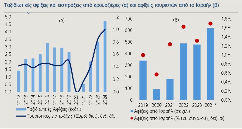 - Άμεσες επιπτώσεις: Παρά την αύξηση κατά 30% των αφίξεων από το Ισραήλ το 2024 (621 χιλ.), αυτές αντιστοιχούν μόλις στο 1,7% των συνολικών αφίξεων. Οι ταξιδιωτικές εισπράξεις από Ισραηλινούς επισκέπτες διαμορφώθηκαν στα 419 εκατ. ευρώ.