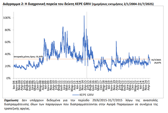 Την ίδια στιγμή, μειωμένη αβεβαιότητα καταγράφεται στην ελληνική χρηματιστηριακή αγορά, όπως αποτυπώνεται από την πτώση του δείκτη KEPE GRIV. Ο δείκτης, ο οποίος υπολογίζεται βάσει των τιμών των δικαιωμάτων προαίρεσης του FTSE/X.A. Large Cap και αποτυπώνει την τεκμαρτή μεταβλητότητα (implied volatility), υποχώρησε στο 24,07% στις 31 Ιουλίου 2025, από 28,92% στο τέλος Ιουνίου.
