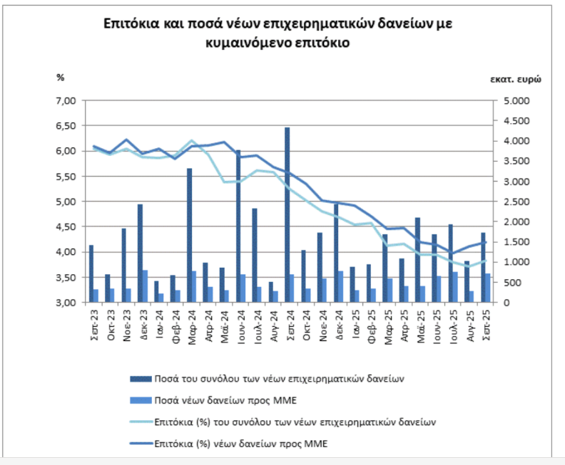 Τον Σεπτέμβριο του 2025, το μέσο σταθμισμένο επιτόκιο των νέων καταθέσεων παρέμεινε σχεδόν αμετάβλητο στο 0,33%, ενώ το αντίστοιχο επιτόκιο των νέων δανείων αυξήθηκε στο 4,51%, σύμφωνα με την Τράπεζα της Ελλάδος.