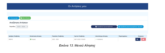 9. Εφόσον ο Διαχειριστής προβεί στην ενεργοποίηση της πληρωμής, τότε επιλέγοντας «Οι Αιτήσεις μου» από το μενού «Υποβολή Αίτησης» (βλ. εικόνα 5), εμφανίζονται τα παρακάτω, όπου εκτός από την εκτύπωση της αίτησής σας πατώντας στο εικονίδιο , υπάρχει και η δυνατότητα για «Προβολή Προκαταβολών» και «Προβολή Διασταυρωμένων Πληρωμών»: