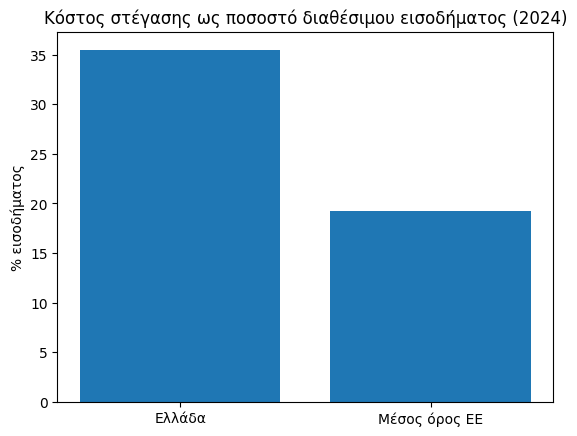 Τα στοιχεία είναι αποκαλυπτικά. Σύμφωνα με τη Eurostat, το 2024 τα ελληνικά νοικοκυριά δαπάνησαν κατά μέσο όρο το 35,5% του διαθέσιμου εισοδήματός τους για τη στέγαση, όταν ο μέσος όρος στην Ευρωπαϊκή Ένωση διαμορφώνεται στο 19,2%. Πρόκειται για μία από τις μεγαλύτερες αποκλίσεις στην ΕΕ, που δεν αφορά μόνο τα χρόνια της κρίσης, αλλά επιμένει και στην περίοδο της ανάκαμψης.