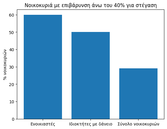 - Μονοπρόσωπα και μονογονεϊκά νοικοκυριά, όπου σχεδόν 2 στα 3 δαπανούν πάνω από το 40% του εισοδήματός τους για κατοικία.