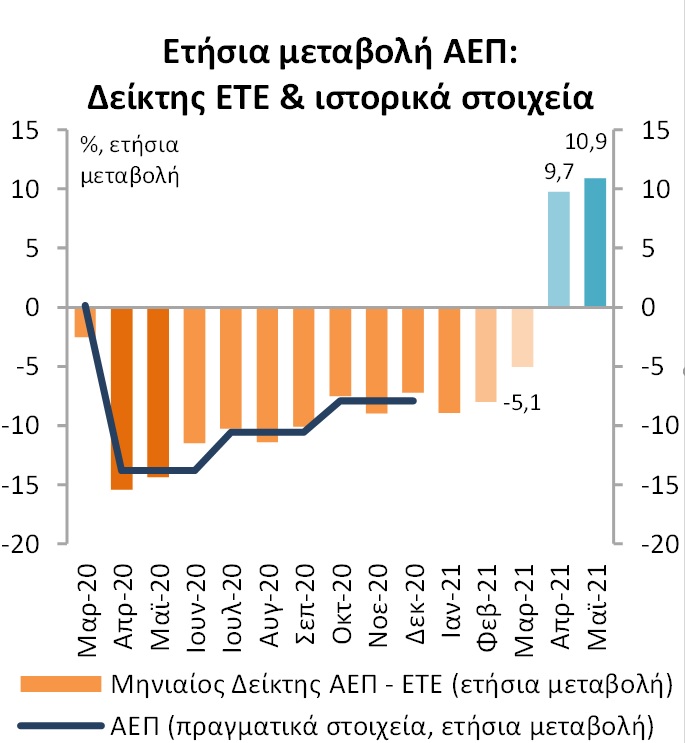 Η επικαιροποίηση του δείκτη της ΕΤΕ βάσει των πλέον πρόσφατων στοιχείων υποδηλώνει μείωση του ΑΕΠ το 1ο τρίμηνο του 2021 μικρότερη του 7,5% ετησίως (αρχική εκτίμηση ΕΤΕ: -9,5% ετησίως - Μάρτιος 2021) κατόπιν ετήσιας μείωσης 7,9% το 4ο τρίμηνο του 2020. Το ΑΕΠ του 1ου τριμήνου εκτιμάται τώρα ότι θα αυξηθεί -για 3ο συνεχόμενο τρίμηνο- με ρυθμό 1,0% σε εποχικά διορθωμένη τριμηνιαία βάση.