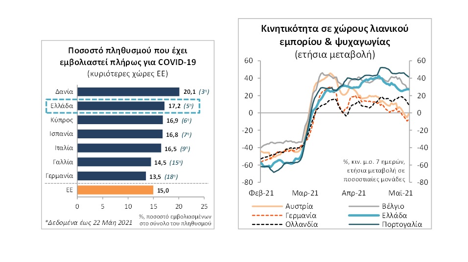 Το εμβολιαστικό πρόγραμμα ανέβασε ταχύτητα τοn Μάιο, με διπλασιασμό του μέσου ημερήσιου αριθμού εμβολιασμών σε περισσότερες από 100 χιλιάδες δόσεις, σε σύγκριση με 54 χιλιάδες δόσεις τον Απρίλιο. Περισσότερο από το 31% του πληθυσμού της Ελλάδας έχει λάβει μία δόση τουλάχιστον έως την 3η εβδομάδα του Μαΐου (συγκριτικά με το 35%, κατά μ.ο., στην ΕΕ), με άνω του 17% του πληθυσμού να έχει εμβολιαστεί πλήρως (15% στην ΕΕ). Το ποσοστό των πλήρως εμβολιασμένων στο σύνολο του πληθυσμού κατατάσσει τη χώρα μεταξύ των 5 κορυφαίων στην ΕΕ, ενώ η τρέχουσα δυναμική των εμβολιασμών καθιστά εφικτή την ανοσοποίηση του 70% του ενήλικου πληθυσμού εντός του 3ου τριμήνου του 2021.