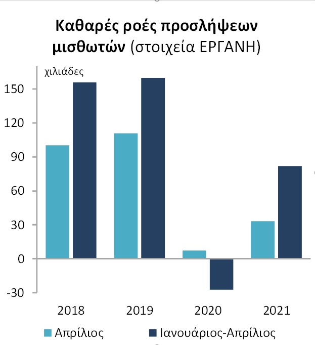 - Οι καθαρές ροές προσλήψεων μισθωτών αυξήθηκαν σε 82 χιλιάδες τους 4 πρώτους μήνες του 2021 (σύμφωνα με το πληροφοριακό σύστημα ΕΡΓΑΝΗ) -σε σχέση με μείωση 27 χιλιάδων την αντίστοιχη περίοδο του 2020-, με προσλήψεις κυρίως στους τομείς παροχής υπηρεσιών εστίασης, διαμονής και υγείας. Το ίδιο χρονικό διάστημα, τα έκτακτα προγράμματα στήριξης της αγοράς εργασίας που εφαρμόστηκαν κατά την περίοδο της πανδημίας αρχίζουν σταδιακά να αποσύρονται. Η εν λόγω απόσυρση ωθεί στην ενεργή αναζήτηση εργασίας και την ταχεία κάλυψη των νέων θέσεων που δημιουργούνται. Εντούτοις, το γεγονός αυτό είναι πιθανόν να έχει ως αποτέλεσμα την επιβάρυνση, προσωρινά, της εικόνας των στοιχείων της έρευνας εργατικού δυναμικού όσον αφορά το ποσοστό ανεργίας τους επόμενους μήνες, καθώς αυξανόμενος αριθμός εργαζομένων που δεν αναζητούσε εργασία κατά το 2020 επανέρχεται στην αγορά που ανοίγει σταδιακά.