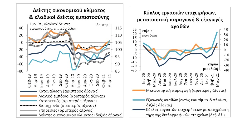 - Ο δείκτης οικονομικού κλίματος (ESI) για την Ελλάδα αυξήθηκε τον Απρίλιο, για 3ο συνεχή μήνα, στις 97,9 μονάδες -υψηλό 12 μηνών. Όλοι οι επιχειρηματικοί τομείς της έρευνας (βιομηχανία, υπηρεσίες, λιανικό εμπόριο και κατασκευές) και η εμπιστοσύνη των καταναλωτών κινήθηκαν σε υψηλότερα επίπεδα. Ειδικά, οι δείκτες εμπιστοσύνης στις κατασκευές και στο λιανικό εμπόριο κατέγραψαν τις μεγαλύτερες σωρευτικές αυξήσεις από την αρχή του έτους, στις 49,1 και 25,3 μονάδες αντίστοιχα, και ανήλθαν σε τιμές που συνεπάγονται επέκταση της δραστηριότητας, για πρώτη φορά από τον Αύγουστο του 2008 και τον Απρίλιο του 2020, αντίστοιχα.