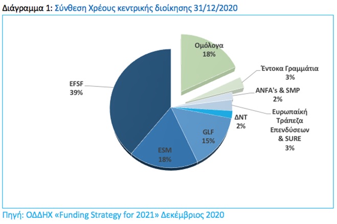 Η σύνθεση του ελληνικού δημόσιου χρέους μετά την αναδιάρθρωσή του, περιλαμβάνει χαμηλότοκα δάνεια πολύ μακράς διάρκειας που έχουν χορηγηθεί μέσω του GLF, EFSF και του ESM τα οποία αντιστοιχούν στο 72% του συνολικού δημοσίου χρέους. Αν προστεθούν σε αυτό τα δάνεια του Διεθνούς Νομισματικού Ταμείου (2%), τα ποσά των ANFA’s και SMP (2%), καθώς και αυτά που έχουν ληφθεί από την Ευρωπαϊκή Τράπεζα Επενδύσεων και μέσω του προγράμματος SURE για την αντιμετώπιση της πανδημικής κρίσης (3%), τότε το συνολικό ποσοστό του ελληνικού δημοσίου χρέους που κατέχει ο επίσημος (official) τομέας ανέρχεται στο 79% του συνόλου.