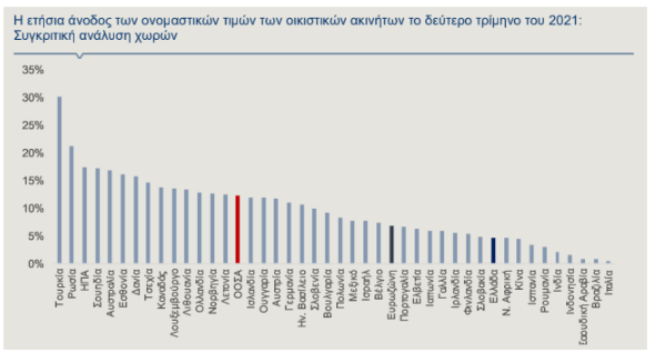 Ακόμα πιο έντονη ήταν η άνοδος των ονομαστικών τιμών των κατοικιών στις χώρες του ΟΟΣΑ (12,3%, κατά μέσο όρο, σε ετήσια βάση), ενώ οι μεγαλύτερες αυξήσεις, σύμφωνα με τα στοιχεία του ίδιου Οργανισμού, σημειώθηκαν στην Τουρκία (30,2%), στη Ρωσία (21,1%) και τις ΗΠΑ (17,4%).