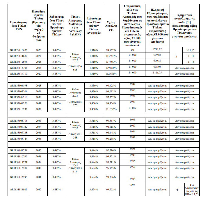 Προσδιορισμένοι Τίτλοι και Σχέσεις Ανταλλαγής Ο κατωτέρω πίνακας περιλαμβάνει τον Κωδικό ISIN, την ημερομηνία λήξης και τη Σχέση Ανταλλαγής για κάθε σειρά Προσδιορισμένων Τίτλων, που χρησιμοποιούνται για να προσδιοριστεί η ονομαστική αξία των Τίτλων Αναφοράς που θα παραδοθούν σε αντάλλαγμα των Προσδιορισμένων Τίτλων που προσφέρονται προς ανταλλαγή. Το τρέχον επιτόκιο των Προσδιορισμένων Τίτλων κατά την πλέον πρόσφατη ημερομηνία καταβολής τόκων είναι 4,30% βάσει του προγράμματος αύξησης επιτοκίου [step up schedule] κάθε σειράς Προσδιορισμένων Τίτλων. Η ελάχιστη ονομαστική αξία των Προσδιορισμένων Τίτλων είναι €1. Η ελάχιστη ονομαστική αξία των Τίτλων Αναφοράς 2033, των Τίτλων Αναφοράς 2037 και των Τίτλων Αναφοράς 2042 είναι €1. Η ελάχιστη ονομαστική αξία των Τίτλων Αναφοράς 2027 είναι €1.000.