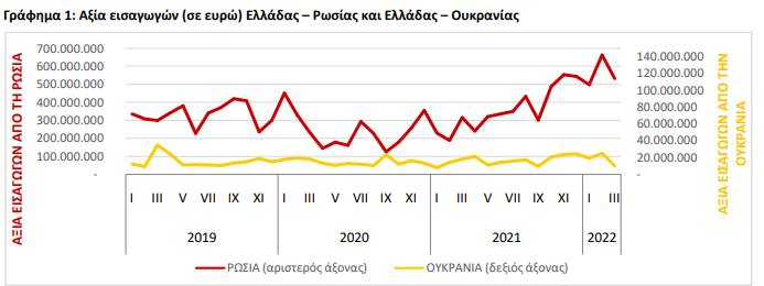 Το α' τρίμηνο εφέτος, η αξία των εισαγωγών από τη Ρωσία ανήλθε σε 1.694,1 εκατ. ευρώ, σημειώνοντας αύξηση 131,4% σε σχέση με την περίοδο Ιανουαρίου- Μαρτίου 2021 (732 εκατ. ευρώ), ενώ η αξία των εξαγωγών ανήλθε σε 34,2 εκατ. ευρώ, σημειώνοντας μείωση 15,8% σε σχέση με το α' τρίμηνο πέρυσι (40,6 εκατ. ευρώ). Έτσι, το εμπορικό ισοζύγιο ήταν αρνητικό σε βάρος της Ελλάδας κατά 1.659,9 εκατ. ευρώ.