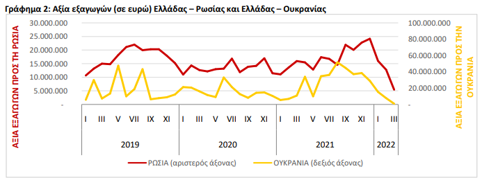 Το α' τρίμηνο, η αξία των εισαγωγών από την Ουκρανία ανήλθε σε 54,3 εκατ. ευρώ, σημειώνοντας αύξηση 33,5% σε σχέση με την περίοδο Ιανουαρίου- Μαρτίου 2021 (40,7 εκατ. ευρώ), ενώ η αξία των ελληνικών εξαγωγών ανήλθε σε 24,2 εκατ. ευρώ, σημειώνοντας αύξηση 5,2% σε σχέση με το α' τρίμηνο πέρυσι (23 εκατ. ευρώ). Έτσι, το εμπορικό ισοζύγιο ήταν αρνητικό σε βάρος της χώρας μας και ανήλθε σε 30,1 εκατ. ευρώ.
