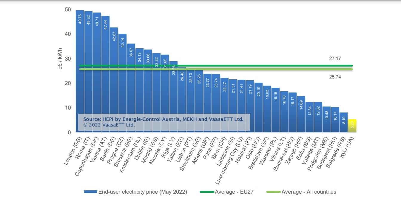 Ακριβότερη ηλεκτρική ενέργεια, πληρώνουν οι οικιακοί καταναλωτές του Λονδίνου (0,4975 ευρώ/kWh), της Ρώμης (0,4932 ευρώ/kWh), της Κοπεγχάγης (0,4871 ευρώ/kWh), της Βιέννη (0,4744 ευρώ/kWh) κοκ.